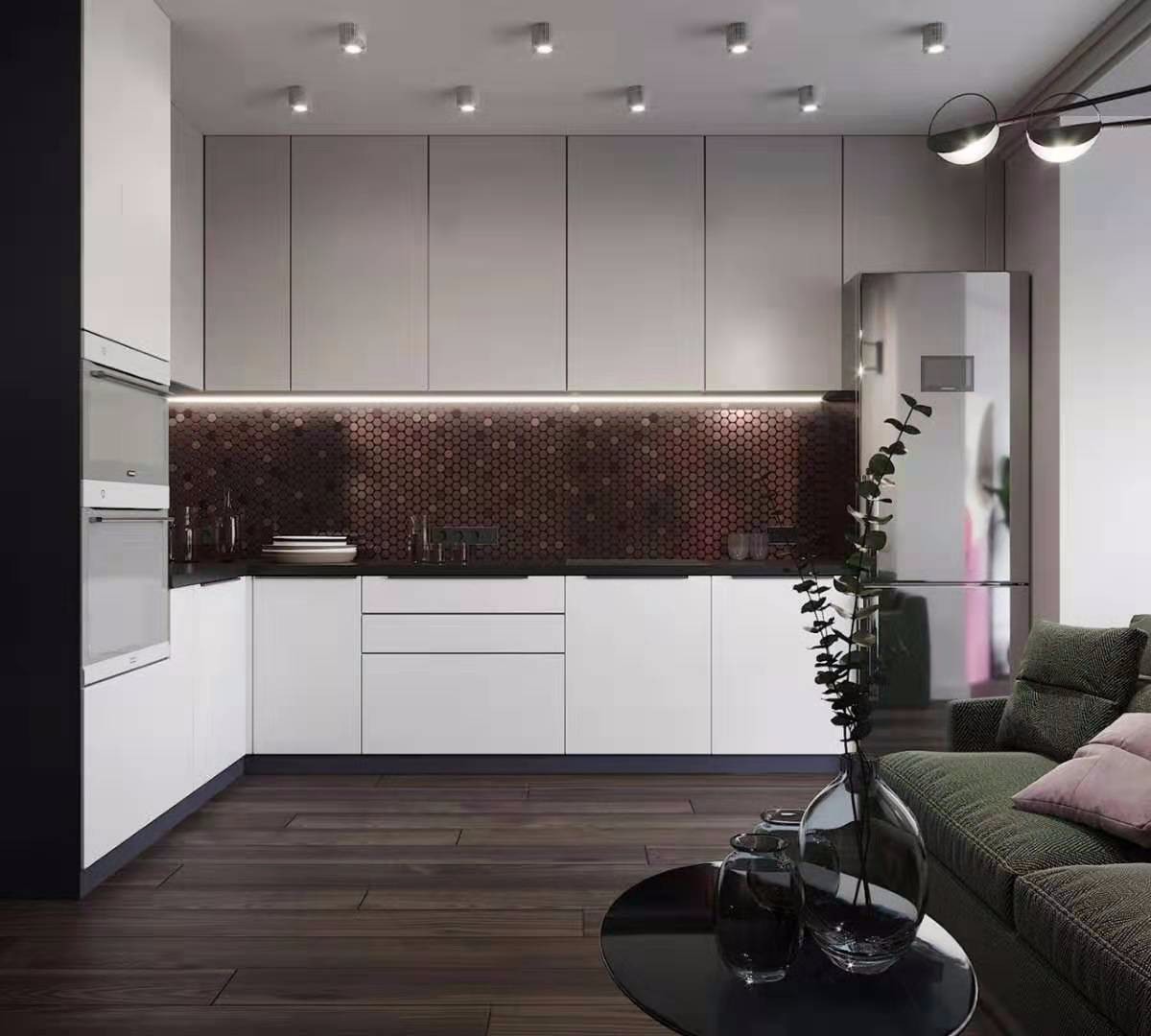 簡單的白色櫥柜搭配深色的墻磚讓廚房的空間脫穎而出。