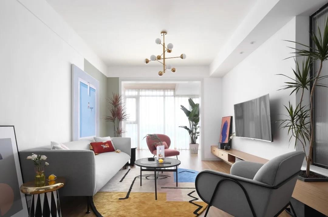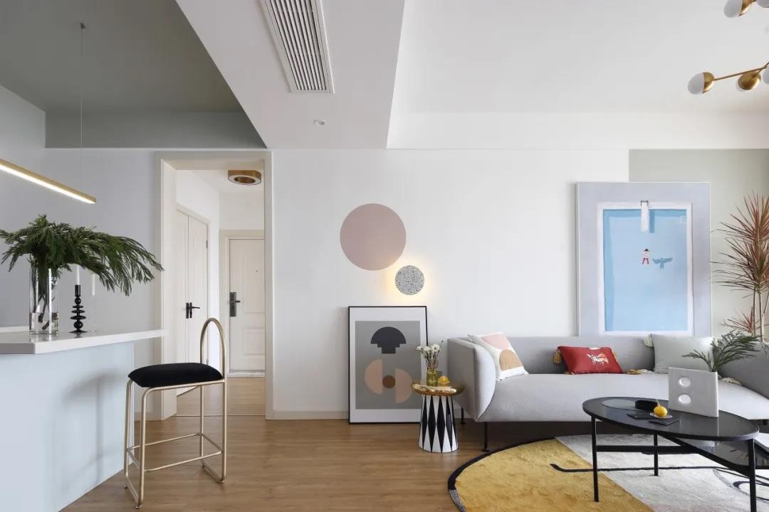 沙發(fā)墻潔凈的墻面加入白色與灰色的雙色設(shè)計,掛放一幅極簡的掛畫,左側(cè)還有兩盞圓形的壁燈?;疑妓嚿嘲l(fā),還有鮮艷活