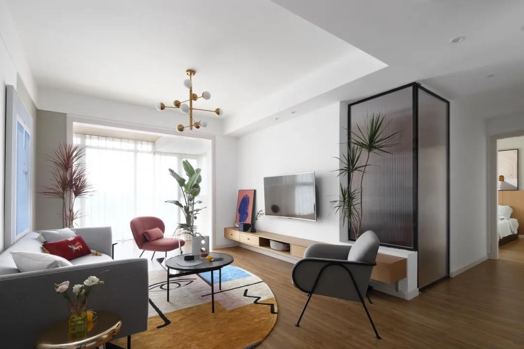 電視墻以懸空的木質(zhì)電視柜+壁掛電視機,電視墻右邊加入長虹玻璃的室內(nèi)隔斷,讓空間的光線得以共享,同時也增加了空間的設(shè)計感。