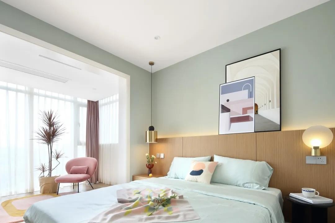 臥室空間整體淡藍(lán)色的墻面,床頭墻的墻腳是木飾面的材質(zhì),加入壁燈吊燈與燈帶,布置裝飾畫,簡約自然的床單,讓空間顯得清新優(yōu)雅而文藝。