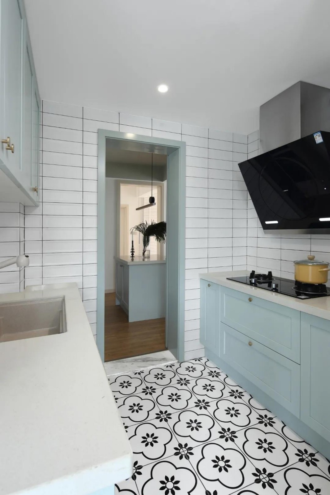 廚房在梅花磚地面+小白磚墻面的空間硬裝,定制淡藍(lán)色櫥柜,白色的臺面,讓做飯的氛圍顯得小資而又文藝舒適。
