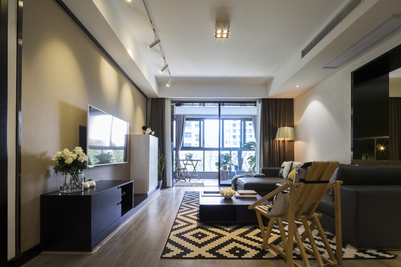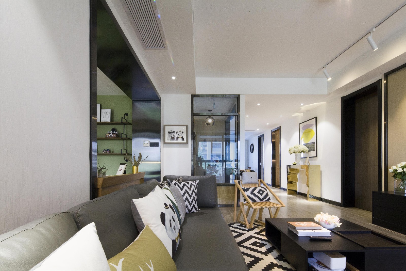 客廳后面是敞開式書房,出挑的黃色沙發(fā)為空間帶來一抹亮色,