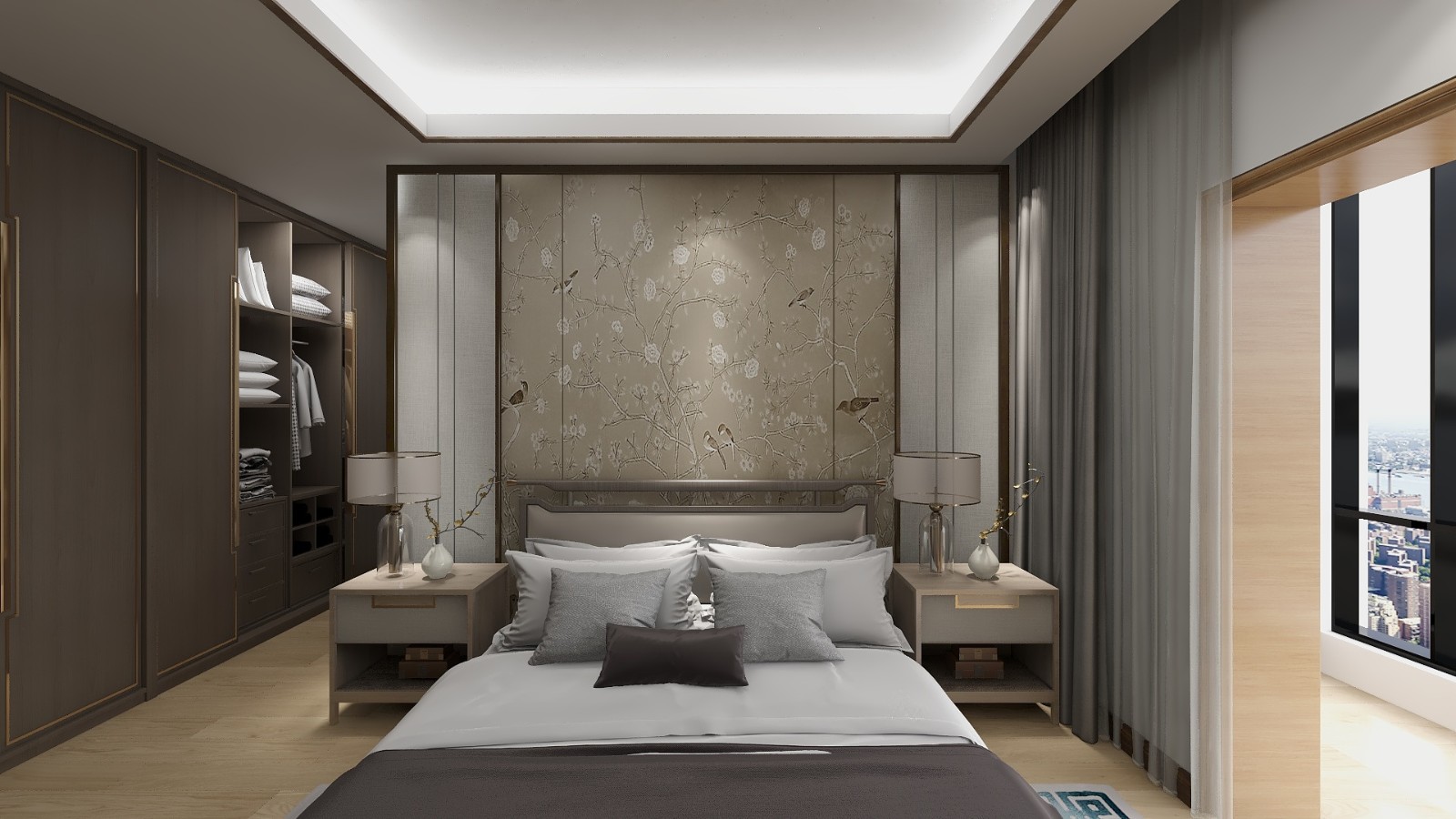 飛鳥意境的墻布搭配暖色性的木飾面襯托出家的溫馨