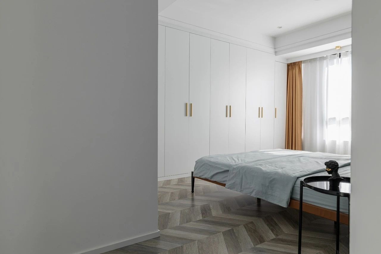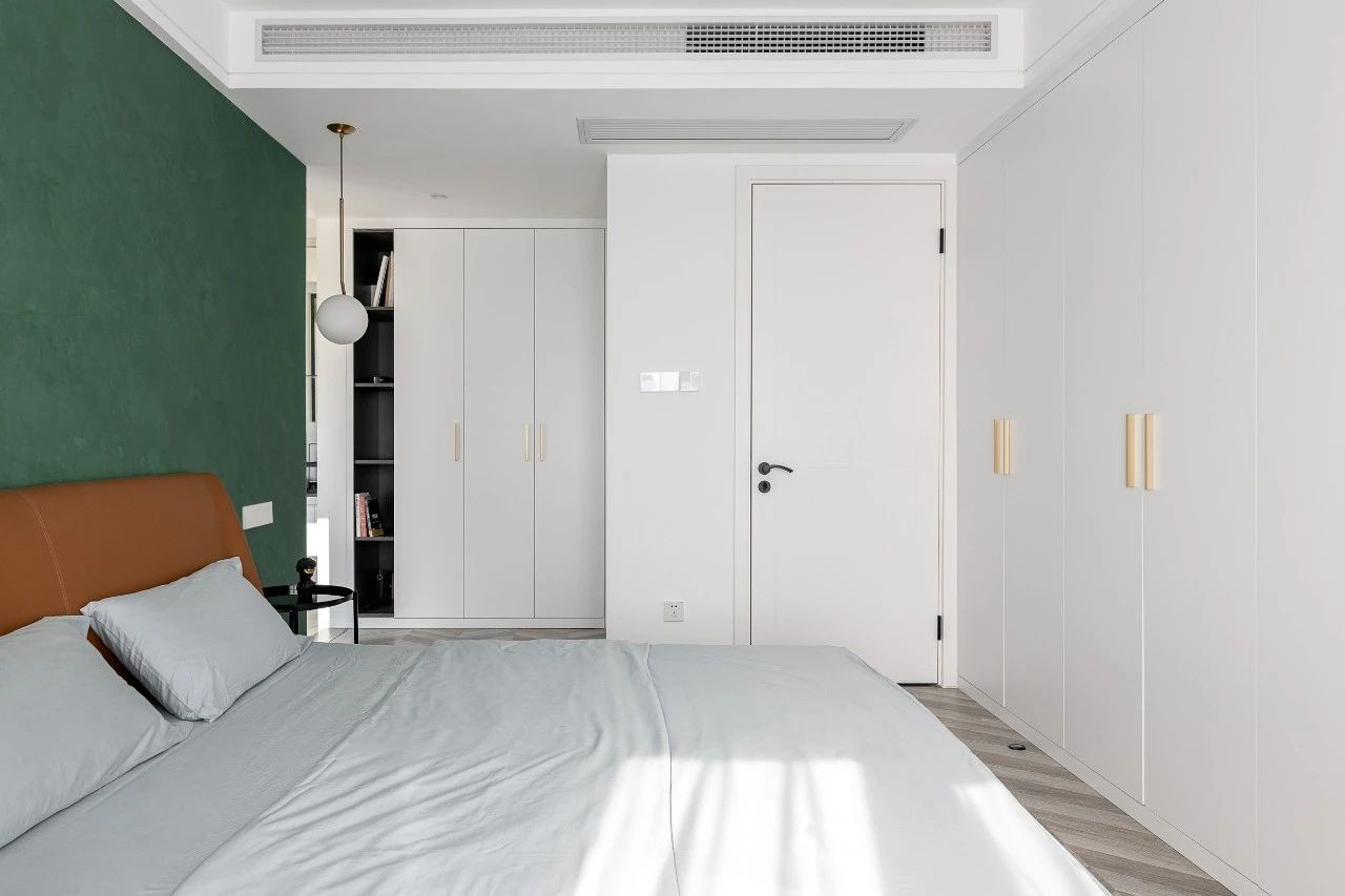 主臥的設(shè)計(jì)也延用了公共空間的配色,墨綠色作為床頭背景色,搭配黃色的皮革床,營(yíng)造出低調(diào)高雅的氣質(zhì)。