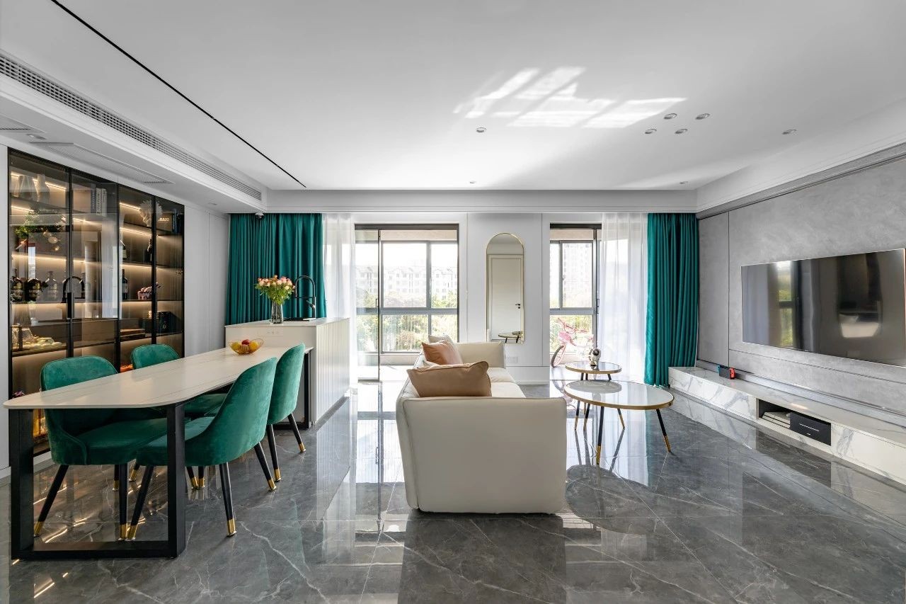 整體以灰白為主,用墨綠、橙色、金屬元素作為點(diǎn)綴,勾勒出空間層次的線條感,營(yíng)造一種活潑輕松的氛圍