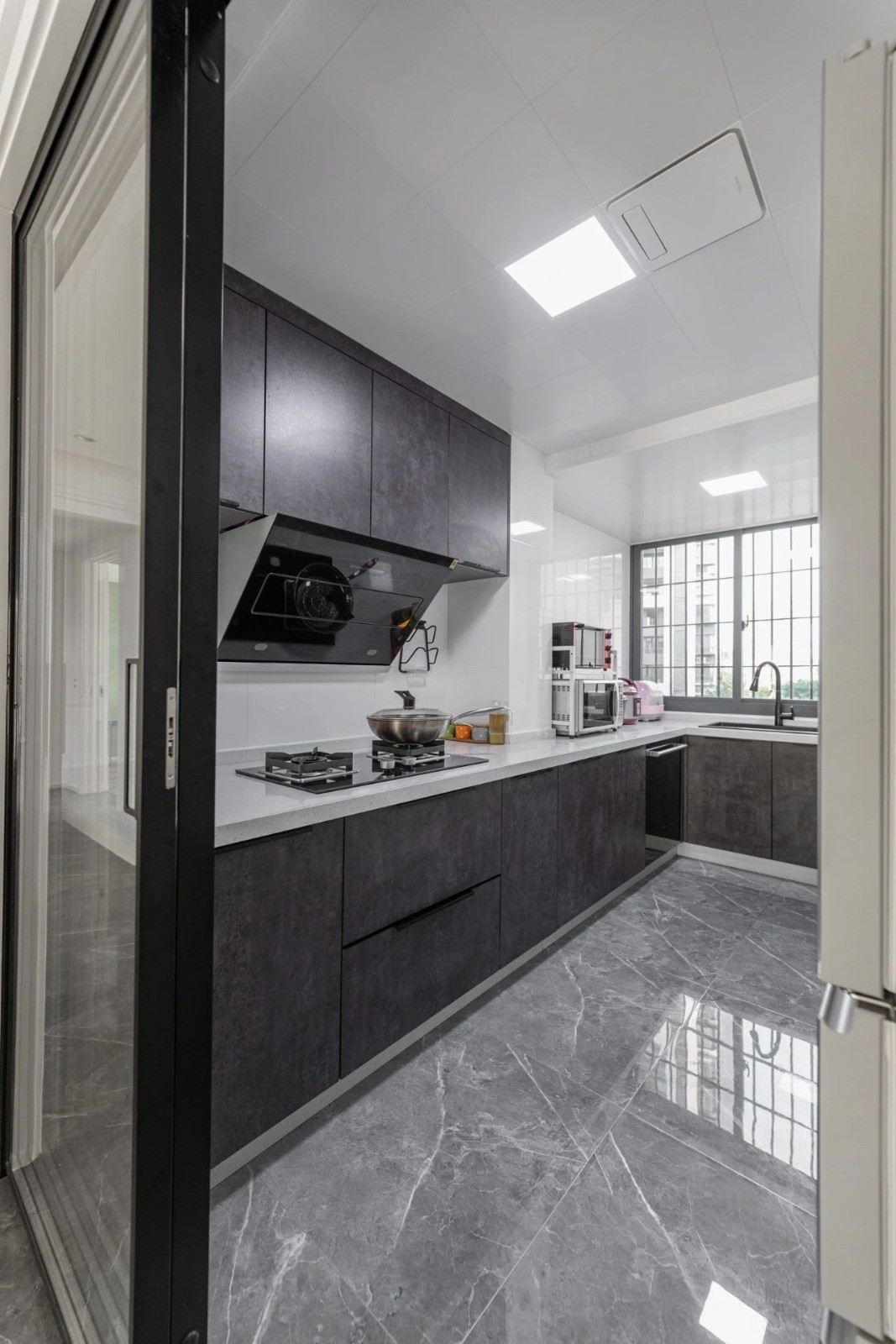 廚房的深色設(shè)計(jì),仿佛沉淀了所有煙火氣,玻璃移門讓空間更加通透明亮,也能看到孩子在客廳的活動(dòng)狀態(tài)。
