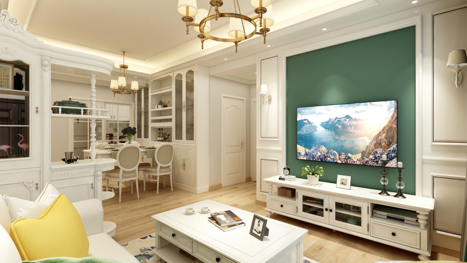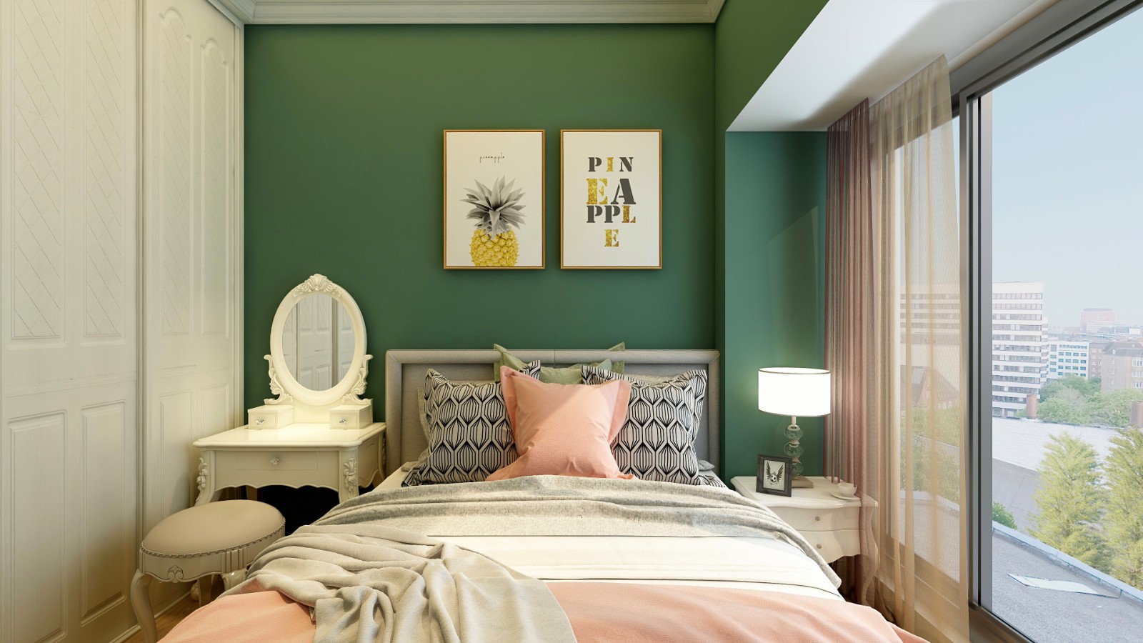 主臥背景墻延續(xù)電視背景墻的墨綠色調(diào),寧靜、閑適、內(nèi)斂,將兩幅黃色系裝飾畫引入空間,增添一絲活躍氣息。