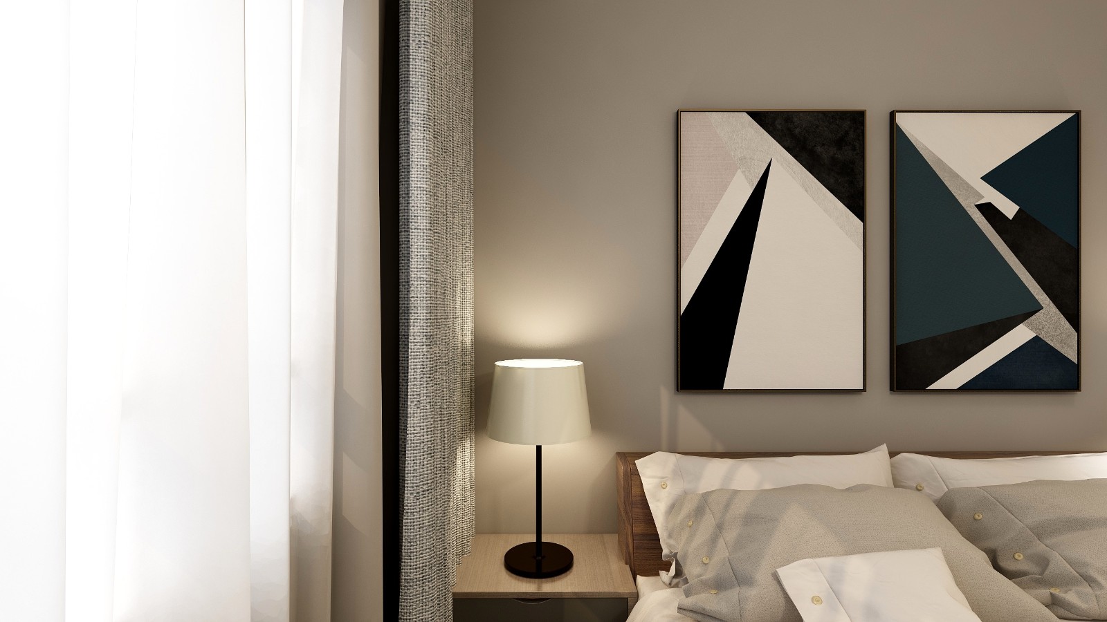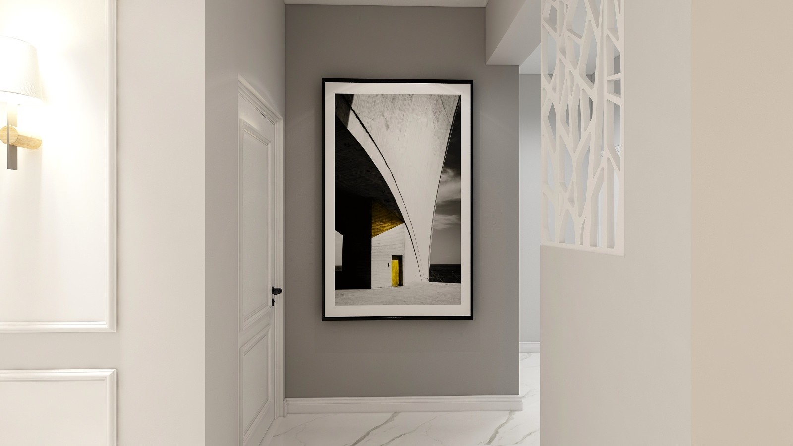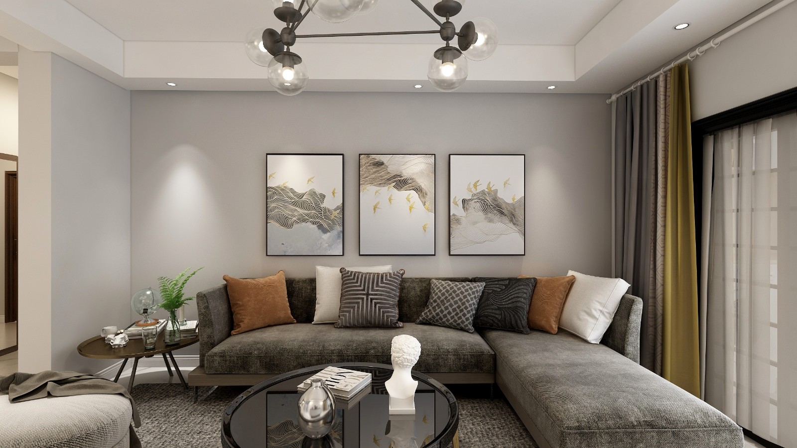 淺灰色的背景墻面漆,時(shí)尚動(dòng)感的簡(jiǎn)約風(fēng)掛畫(huà),十分具有現(xiàn)代風(fēng)。一絲工業(yè)元素的棕灰色沙發(fā)搭配黑色的茶幾,深灰色加入一抹亮色黃,使空間的流行元素渲染出來(lái)。